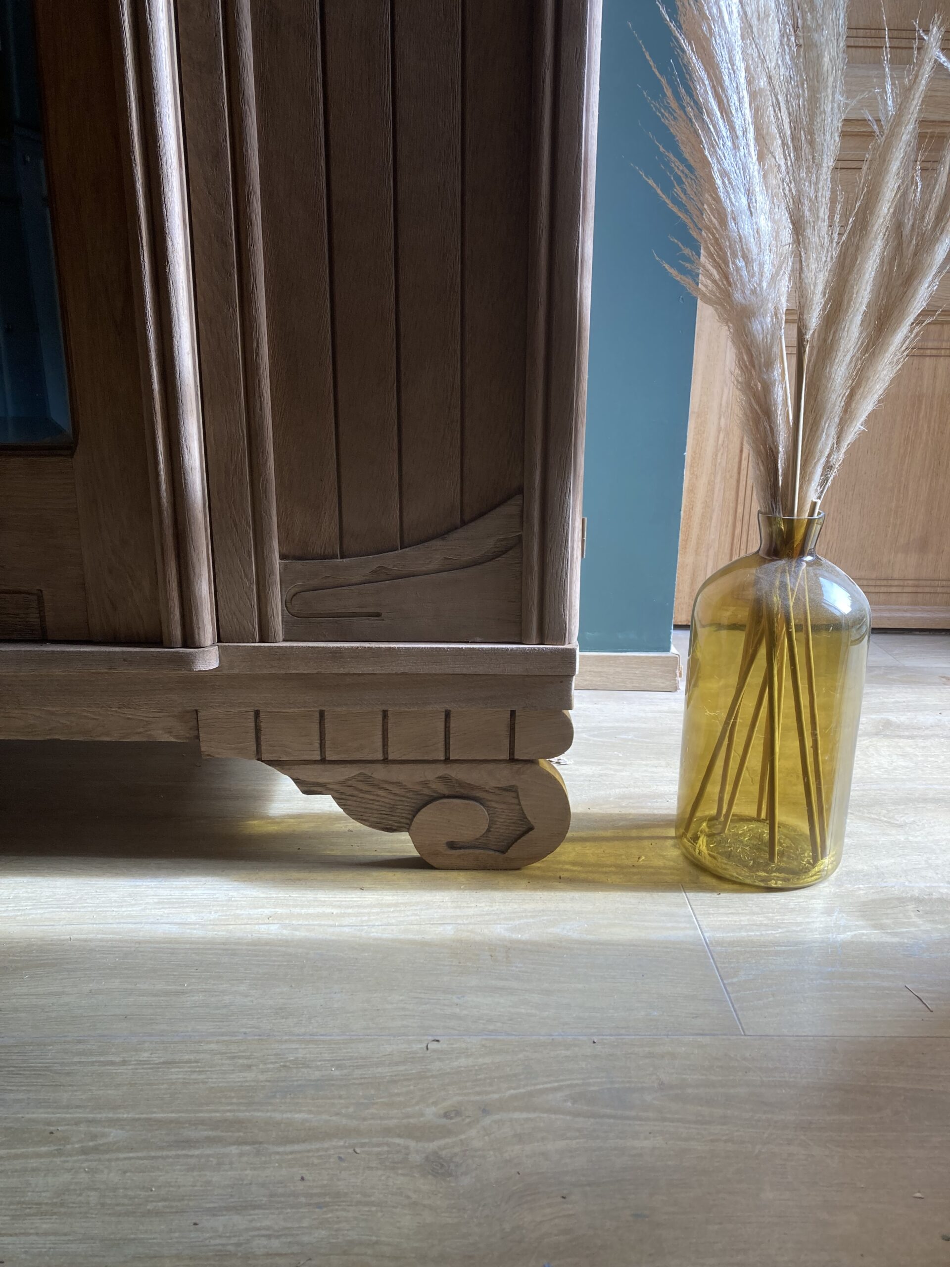 Réalisée en chêne, elle séduit par ses lignes typiques et ses détails sculptés pleins de charme.