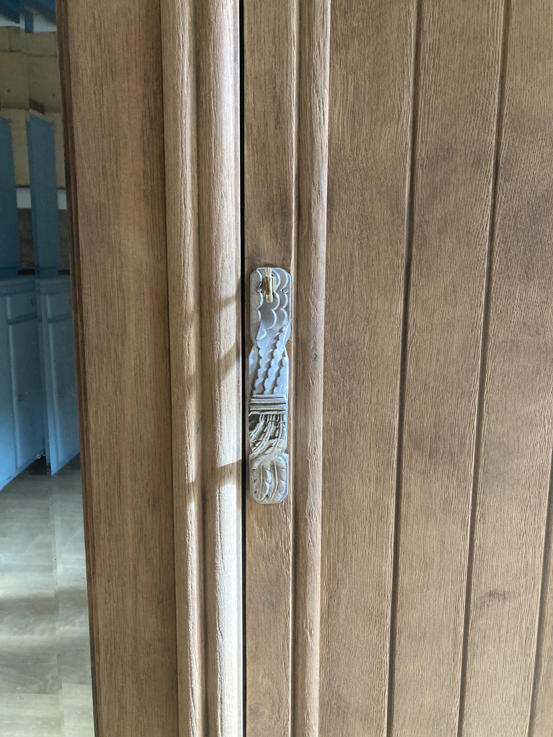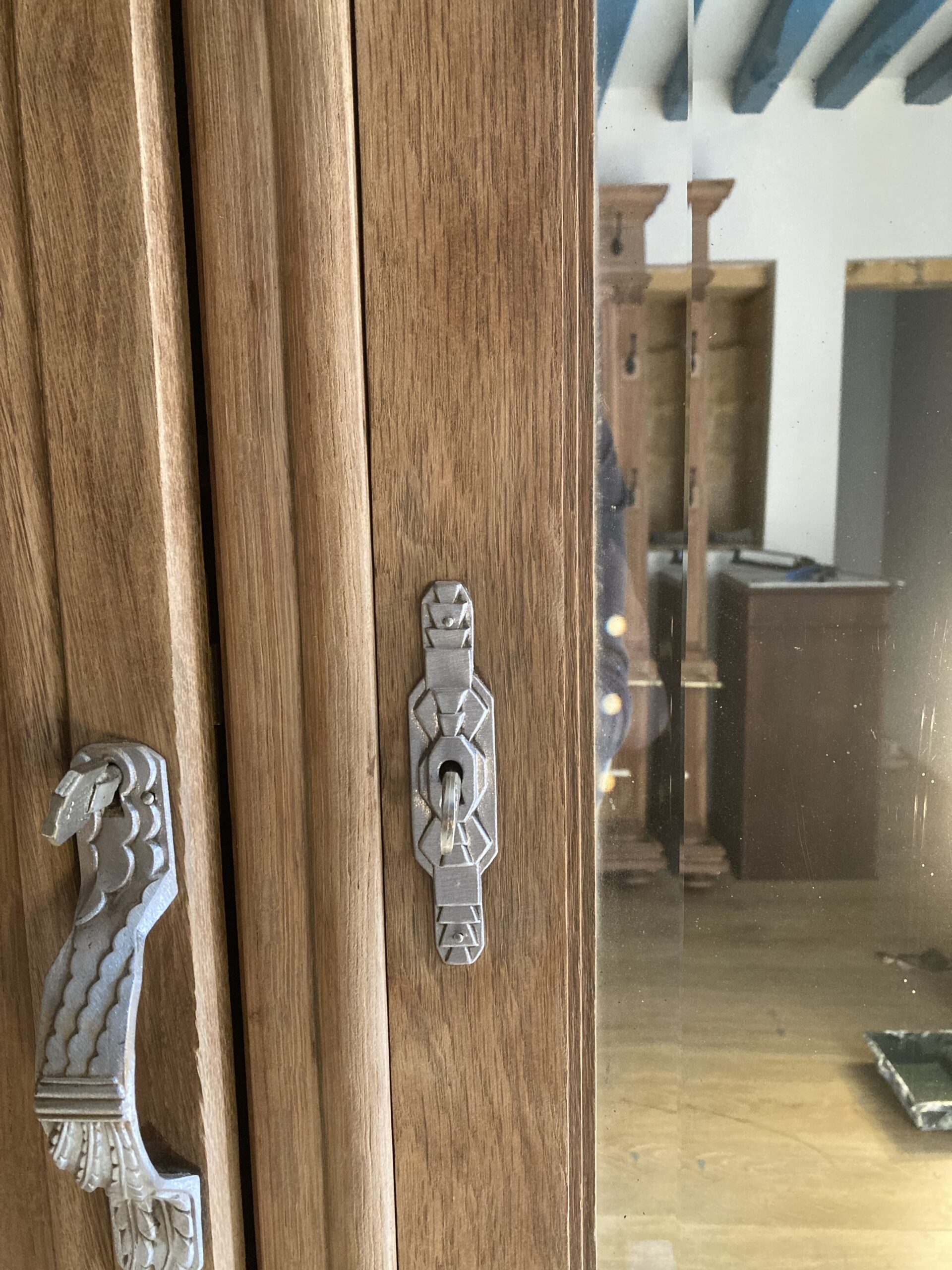 Cette grande armoire Art Déco à trois portes est dotée d’une belle capacité de rangement, celle-ci ferment normalement, à noter la présence des clés d’origine, mais les serrures ne fonctionnent plus.