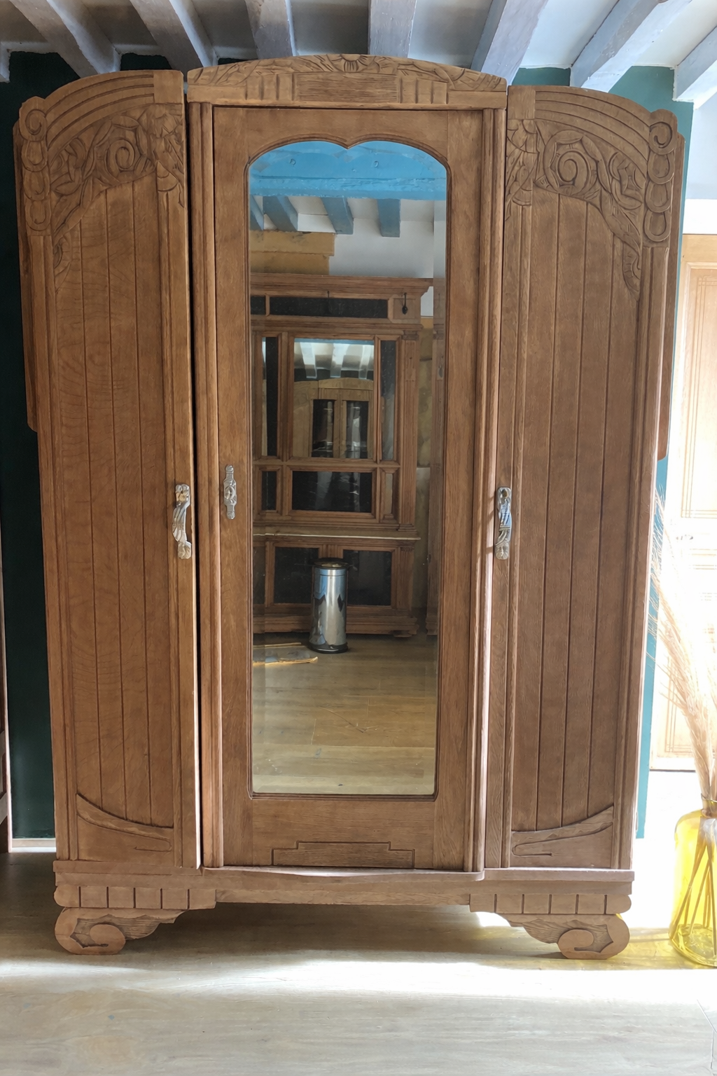 Cette magnifique armoire Art Déco en chêne massif sculpté incarne tout le charme des années 30, entièrement rénovée, nettoyée, poncée.