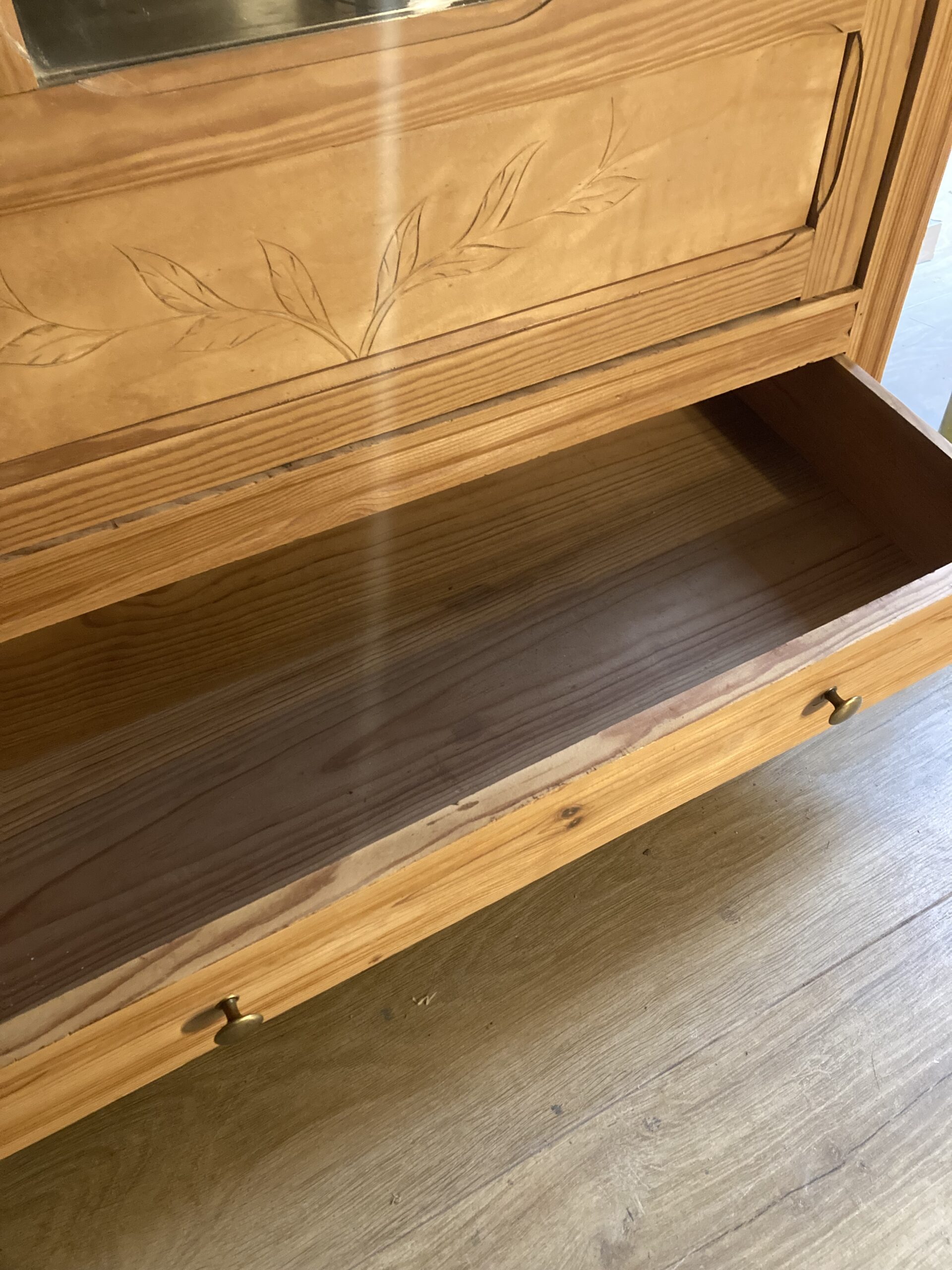 Motifs art déco sur la porte, qui s’ouvre parfaitement, sur 3 étagères, dont 1 avec un tiroir.