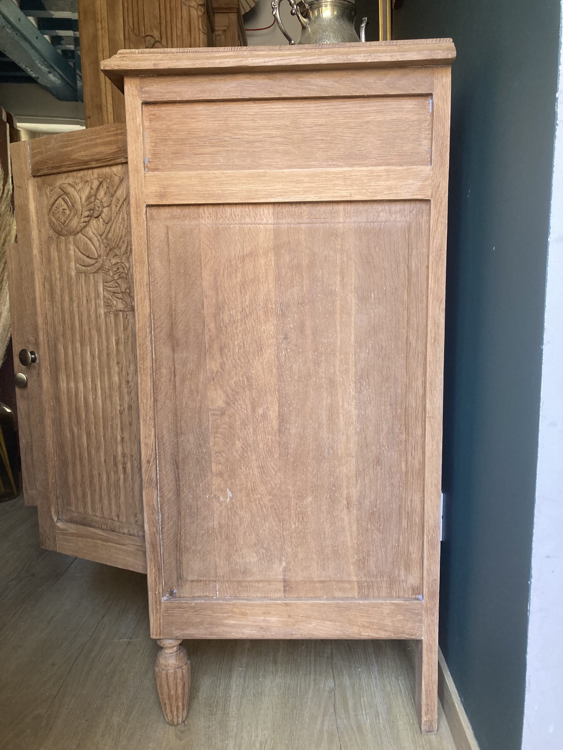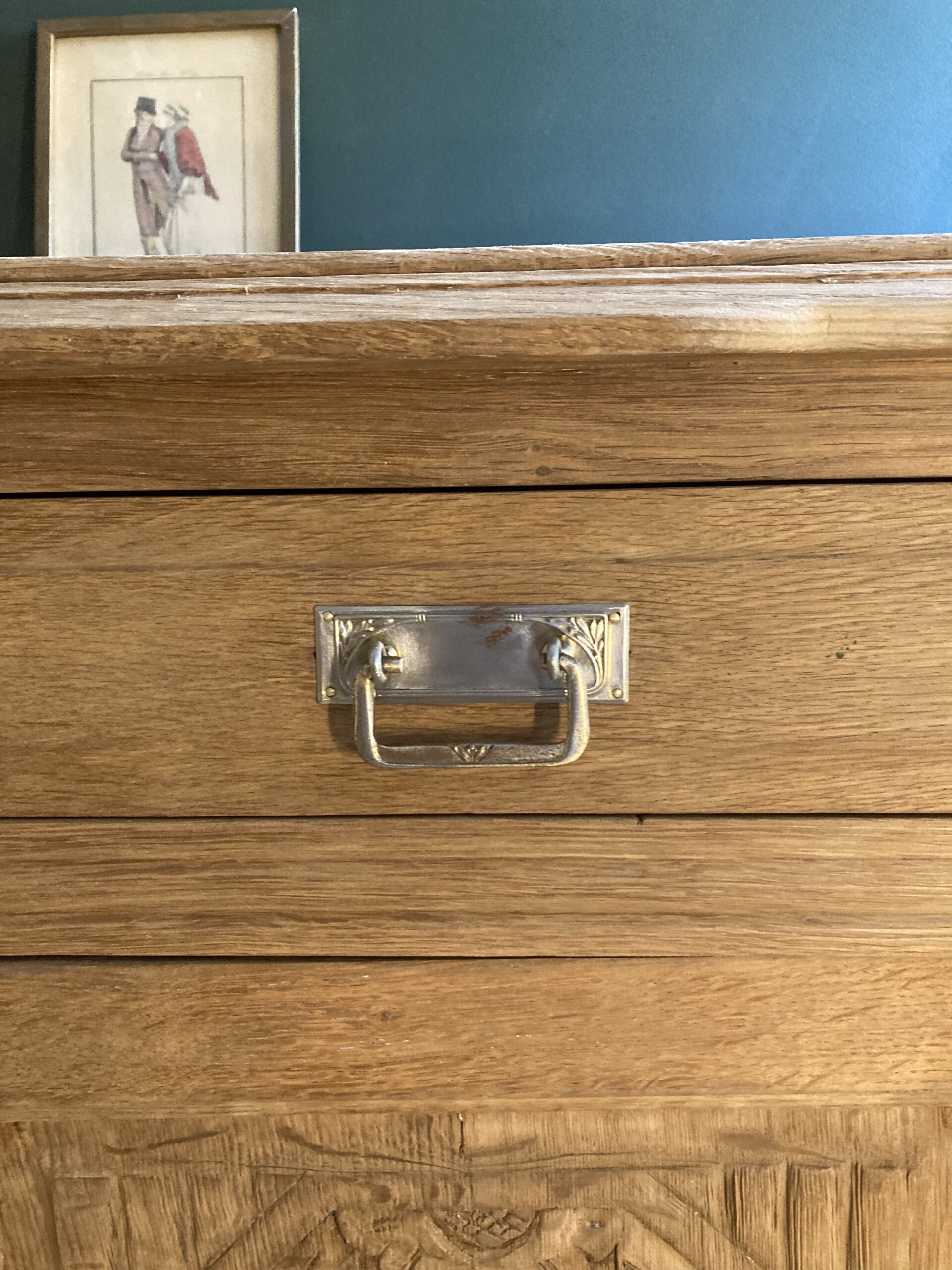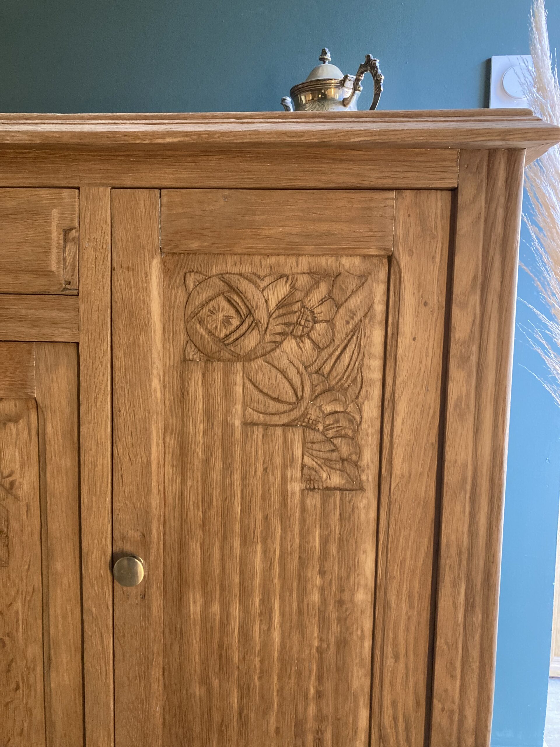 Son veinage naturel, met en valeur les motifs floraux sculptés des 3 portes, le tiroir dispose de la poignée d’origine . L’intérieur a été peint avecla couleur une souris verte de chez Bilboquet.