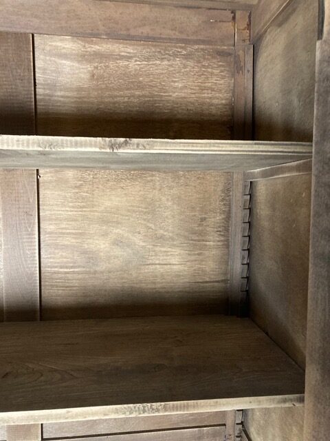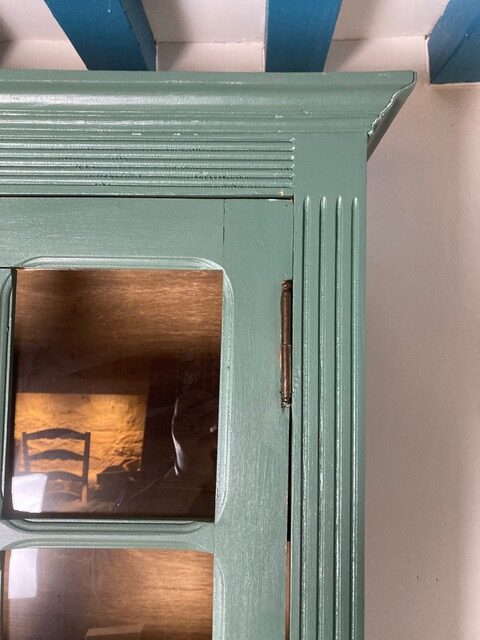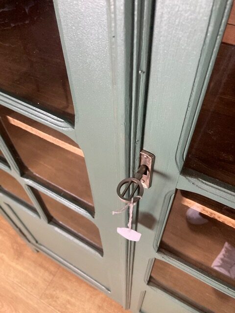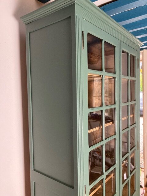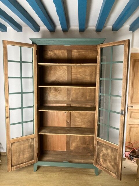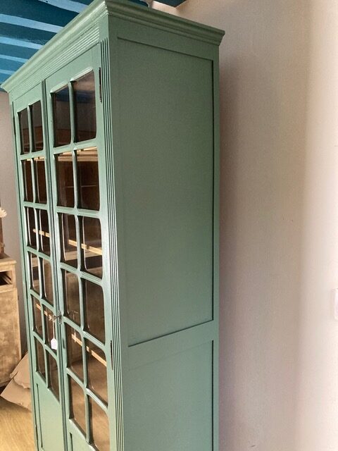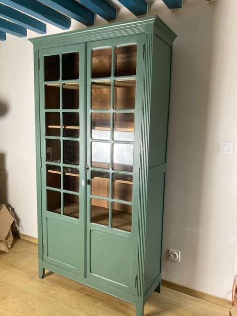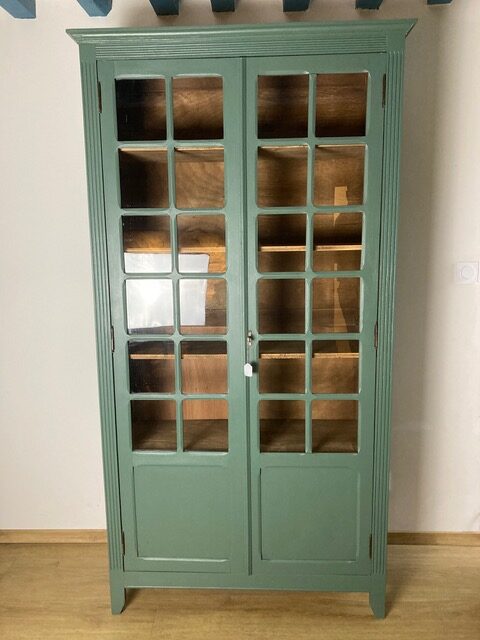 Capacité importante: livres, DVD, vinyles 33 tours ou collections diverses. Ce meuble a été entièrement rénové et peint en vert.